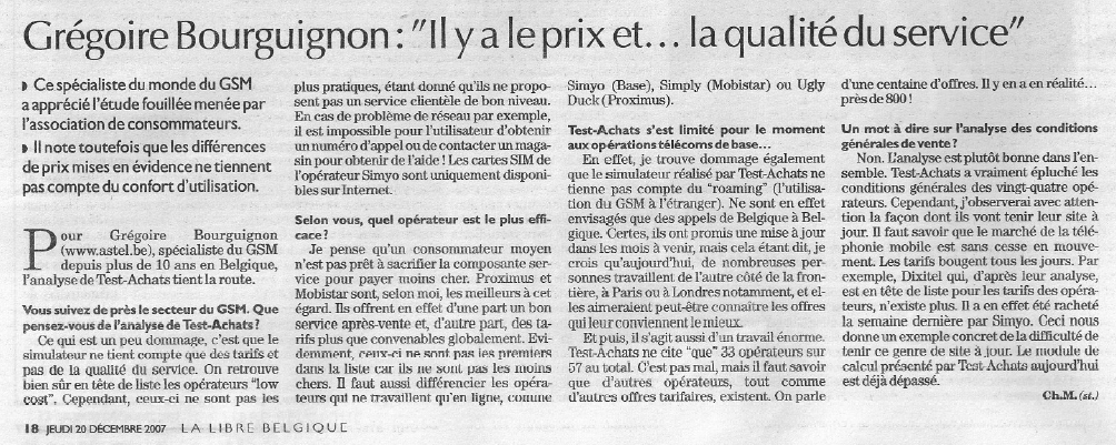 J'ai testé le test en mettant ma consommation mensuelle ; évidemment c'est approximatif mais le résultat du test était que le meilleur opérateur qui pourrait me convenir est proximus avec je ne sais plus quelle formule et que cette formule, apparemment la plus adaptée à mes besoins, me couteraient 67,70€ / mois alors que j'en paie 20 par mois chez mobistar