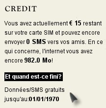 D'ailleurs, si on avait chargé le 26/02 à 11h30, le trafic sms/data redeviendra payant le 26/03 à 11h30, ce qui est inhabituel vu qu'en général c'est par 24h que ces choses-là sont comptabilisées.