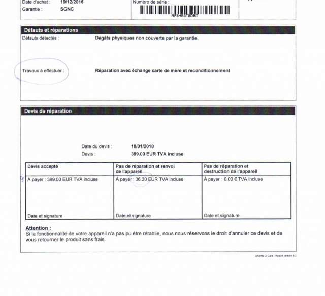Je dois dès lors signer un document (avec lequel je suis d'accord concernant les légers coups) mais stipulant également que le ***** coutera 35€ si je veux récupérer le gsm sans réparation et que la garantie ne fonctionne pas.