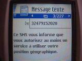 On reçoit depuis le 12 août 2004 un SMS de Proximus tous les jeudis à 11h02 du matin, envoyé à partir du numéro 0479152020 avec le message suivant : Ce SMS vous informe que vous autorisez au moins un service à utiliser votre position géographique ; alors que le service de localisation n’est pas activé pour le numéro mobile concerné.