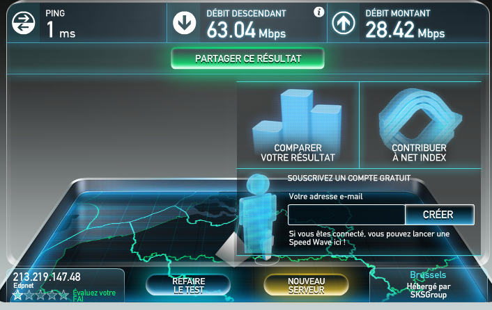Là je suis chez mes parents avec 2 lignes, je paye ma ligne, eux sont chez proximus avec une connexion basique, ils ont plus que moi en envoi et en réception ça tourne à la même chose environ sachant qu'ils sont en wifi qui traverse plusieurs murs.