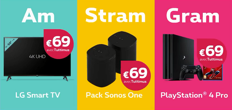 Am, Stram, Gram, voici la promotion Proximus de fin d'année : 69 euro pour soit une smart TV LG de 50 pouces (699 euro), soit une PlayStation 4 pro 1 TB (429 euro), soit deux enceintes sans fil Sonos One (458 euro) avec un nouvel abonnement internet Proximus en pack Tuttimus.