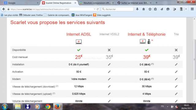Maintenant, sache qu'il est tout à faire possible que les 3 services soit disponibles chez Proximus et pas chez Scarlet étant donné que Proximus peut desservir ces services même si il n'y a pas de technologie VDSL à ton adresse alors que Scarlet la nécessite obligatoirement dès qu'il y a la télévision.