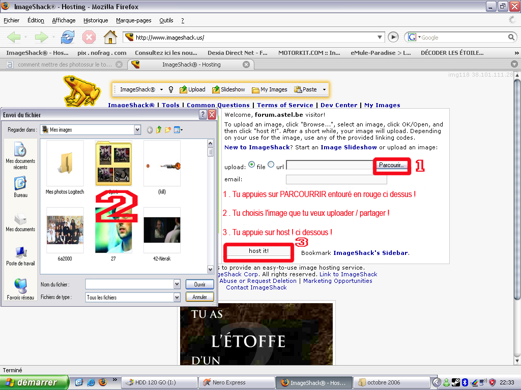 Envoyé par huggy Voir le messagebonsoir xenthos je vais essayé de t'expliqué tu upload les photos sur se site http://www.imageshack.us/ puis quand tu crée ton post au dessus tu as un petit icone en forme de paysage avec des montagnes tu cliques dessus et tu colles ton lien
