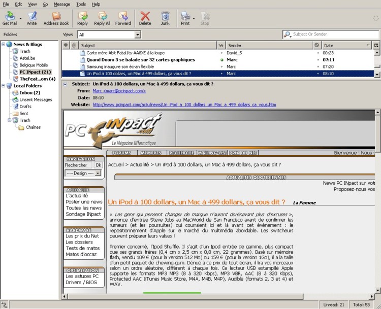 Salut, voila, je suis entrain de tester thunderbird et j'ai créé un canal "news & blog" spécialement pour Astel. Le problème, c'est qu'il ne "feed" que l'entête de l'article, la partie visible sur la home page et pas l'artcicle en entier.