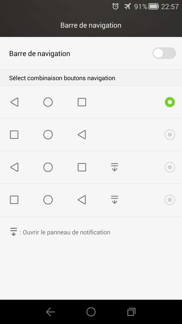 Si l'option tout au-dessus est activée, la barre de navigation disparait et elle apparait uniquement lorsqu'on fait un swype vers le haut.