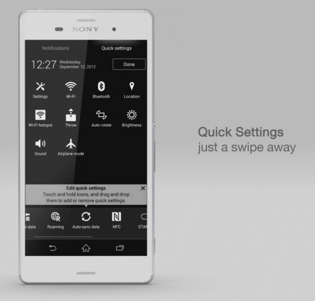 “Quick Settings” dans le menu déroulant peut maintenant être modifié plus rapidement, vous pouvez glisser et déposer les options que vous voulez directement dans le menu des options rapides. Vous pouvez aussi appuyer longuement chaque option pour charger l'affichage complet des options.
