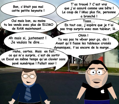 • Les Imac ont débarqués, j'ai pu voir un débarquement à Louvain-la-neuve, et j'ai donc vu le déballage d'une bête de 24 pouces....magnifique vraiment. Une belle finition. Par contre pas eu le temps de voir le clavier.