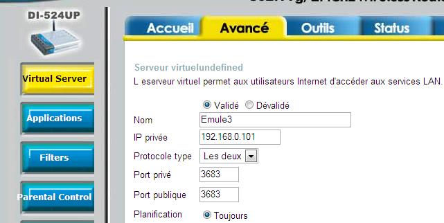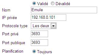 Emule a le port 3683 en UDP et 3693 en TCP et voici ce que j'ai dans la config du routeur: